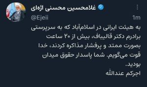 وی افزود : به هیئت ایرانی در اسلام آباد که به سرپرستی برادرم دکتر قالیباف ، بیش از 20 ساعت بصورت ممتد و پرفشار مذاکره کردند خدا قوت می گویم .